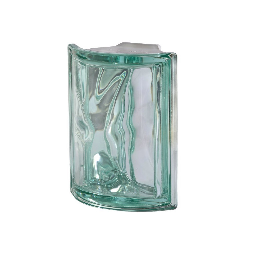 Rohová luxfera ( 90°). Barevná lesklá tvárnice s dekorem "vlnky" z vnitřní strany tvárnice. Metalický boční nástřik propůjčuje tvárnici "kovovou patinu" a zvyšuje propustnost světla. Možnost realizace na minimální spáru (2mm). Oblíbený dekor, snadná údržba. Nevhodné do exteriéru.