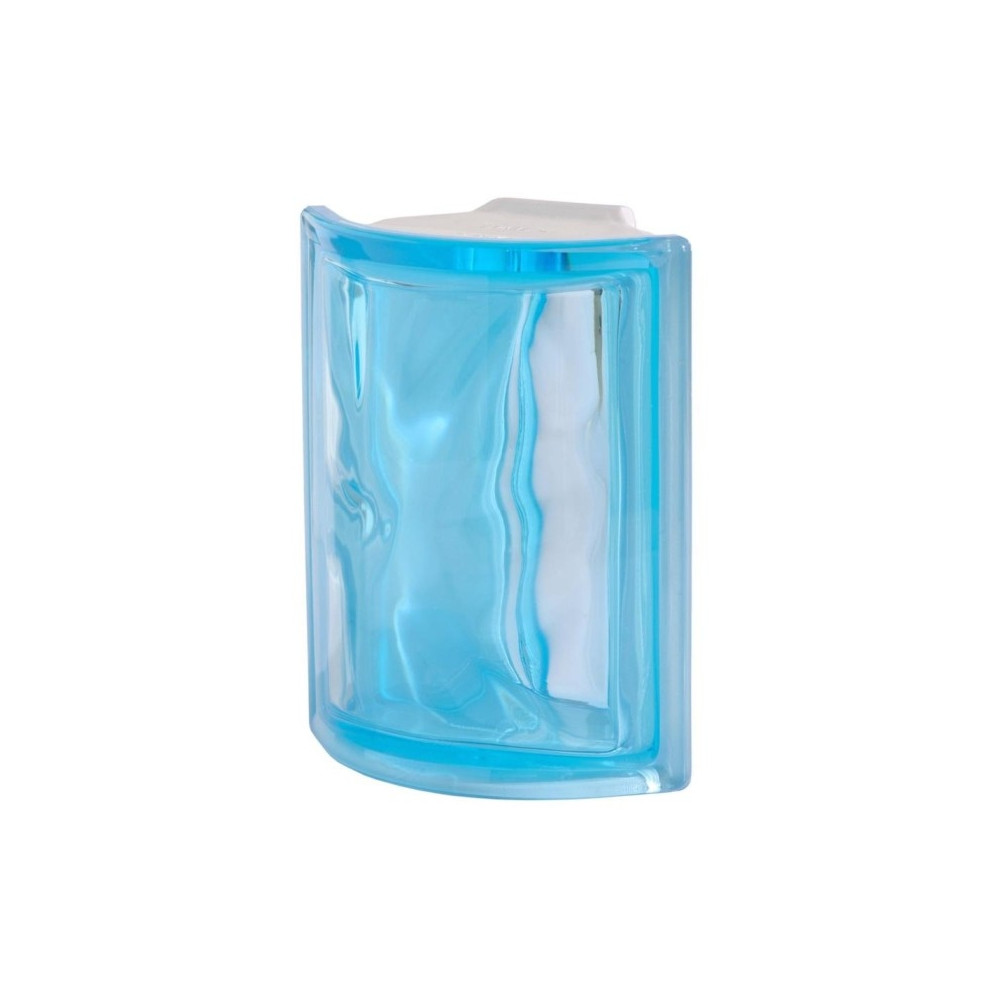 Rohová luxfera ( 90°). Barevná lesklá tvárnice s dekorem "vlnky" z vnitřní strany tvárnice. Možnost realizace na minimální spáru (2mm). Oblíbený dekor vlnky částečně "rozbíjí obraz" za tvárnicí. Snadná údržba. Vhodné do sprchových koutů, interiéru i exteriéru.