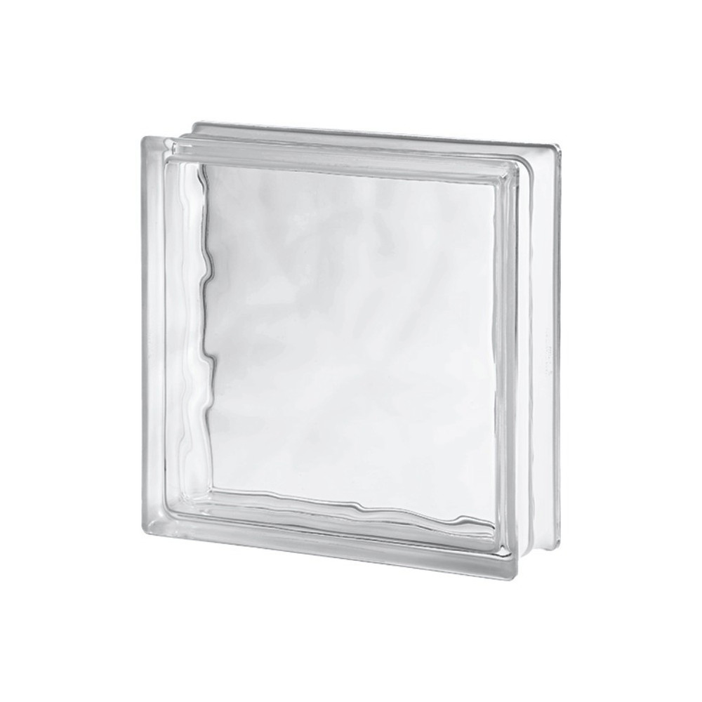Bezbarvá luxfera v netypickém formátu 30 x 30 x 10 cm. Díky velkému formátu je stěna z těchto tvárnic zajímavá, s malým počtem spár. Díky lesklému povrchu snadná údržba a velká propustnost světla. Dekor vlnky částečně deformuje obraz za stěnou.
