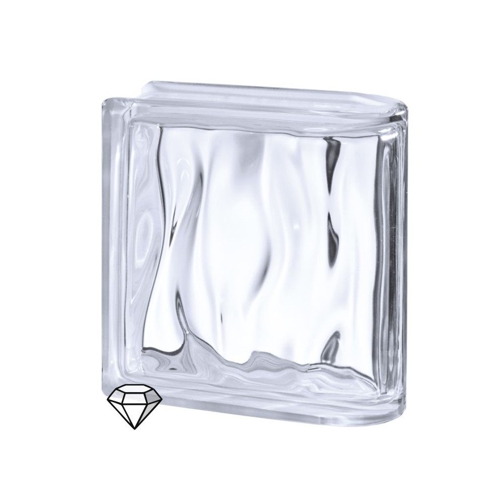 Ukončovací čirá tvárnice s dekorem "mořské vlnky" z vnitřní strany tvárnice, velkou propustností světla a snadnou údržbou. Extra čirá sklovina! Tvárnice je určena pro stěny s volnou stěnou do prostoru.