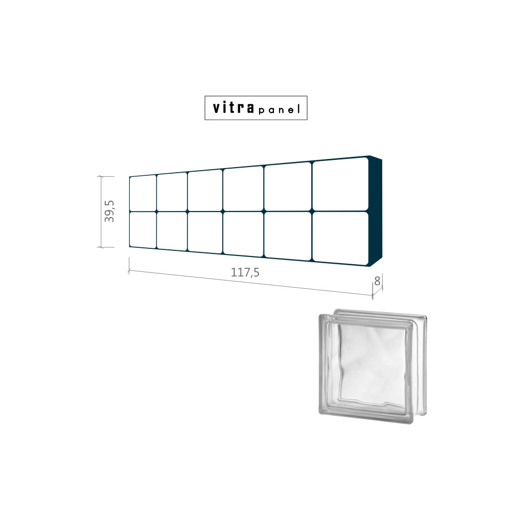 Smontovaný interiérový panel, připravený pro osazení do stavebního otvoru. Panel se montuje do stěn v interiéru. Není určen pro podlahy a venkovní stěny. Tento konkrétní panel je proveden z lesklých tvárnic, které propouštějí světlo, a částečně deformují prostředí za panelem. VITRApanel lze vyrobit i v jiných velikostech za použití různých barev a typů skleněných tvárnic. Více informací se dozvíte ZDE.