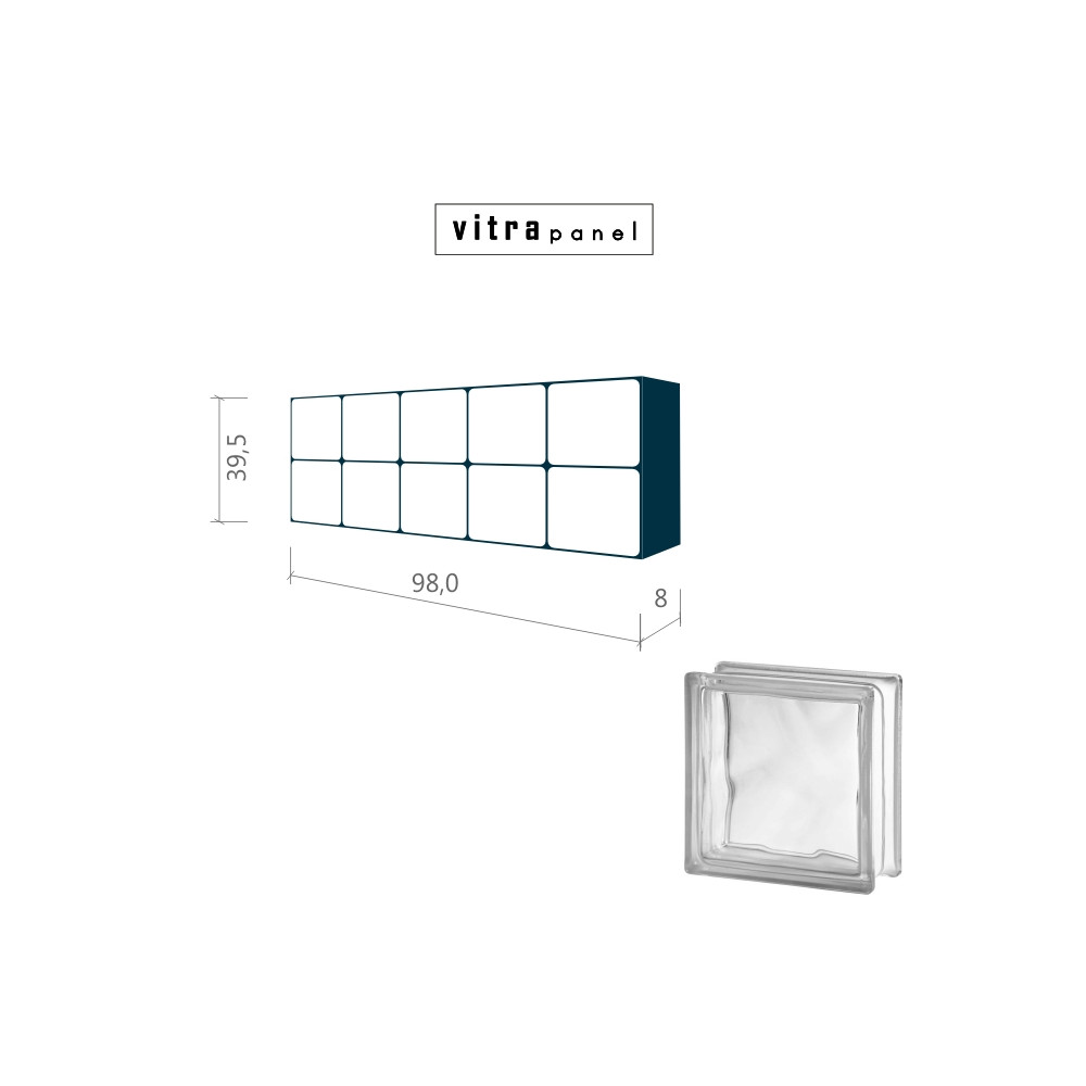 Smontovaný interiérový panel, připravený pro osazení do stavebního otvoru. Panel se montuje do stěn v interiéru. Není určen pro podlahy a venkovní stěny. Tento konkrétní panel je proveden z lesklých tvárnic, které propouštějí světlo, a částečně deformují prostředí za panelem. VITRApanel lze vyrobit i v jiných velikostech za použití různých barev a typů skleněných tvárnic. Více informací se dozvíte ZDE.