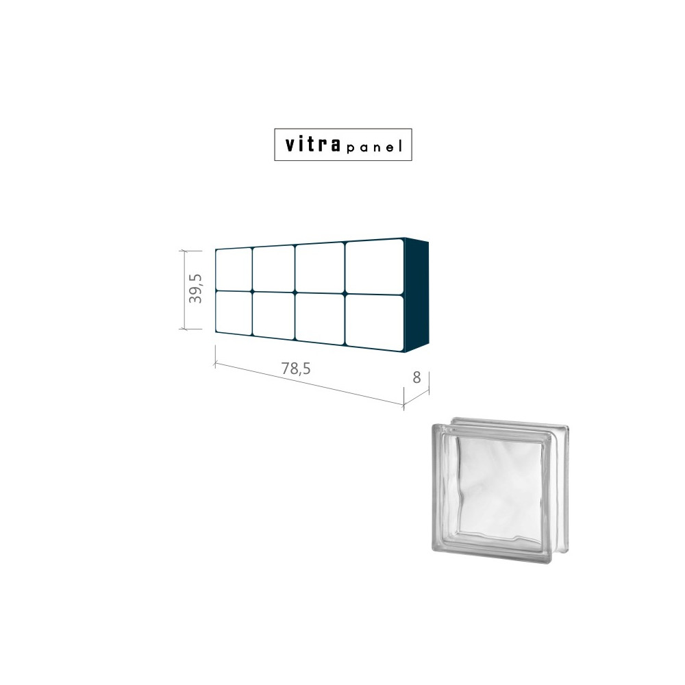 Smontovaný interiérový panel, připravený pro osazení do stavebního otvoru. Panel se montuje do stěn v interiéru. Není určen pro podlahy a venkovní stěny. Tento konkrétní panel je proveden z lesklých tvárnic, které propouštějí světlo, a částečně deformují prostředí za panelem. VITRApanel lze vyrobit i v jiných velikostech za použití různých barev a typů skleněných tvárnic. Více informací se dozvíte ZDE.