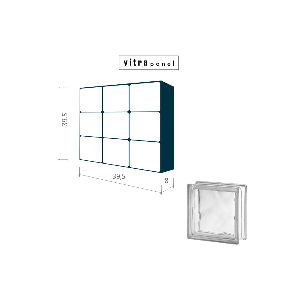 Smontovaný interiérový panel, připravený pro osazení do stavebního otvoru. Panel se montuje do stěn v interiéru. Není určen pro podlahy a venkovní stěny. Tento konkrétní panel je proveden z lesklých tvárnic, které propouštějí světlo, a částečně deformují prostředí za panelem. VITRApanel lze vyrobit i v jiných velikostech za použití různých barev a typů skleněných tvárnic. Více informací se dozvíte ZDE.