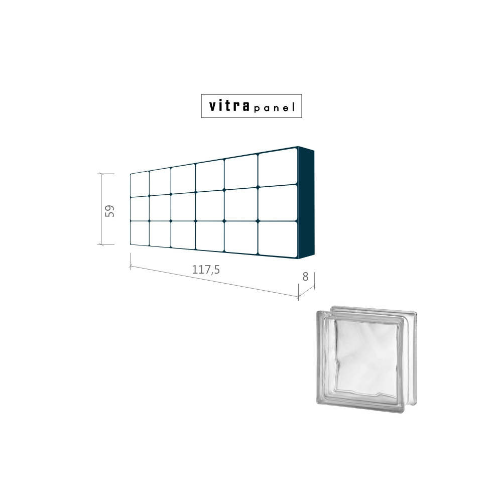 Smontovaný interiérový panel, připravený pro osazení do stavebního otvoru. Panel se montuje do stěn v interiéru. Není určen pro podlahy a venkovní stěny. Tento konkrétní panel je proveden z lesklých tvárnic, které propouštějí světlo, a částečně deformují prostředí za panelem. VITRApanel lze vyrobit i v jiných velikostech za použití různých barev a typů skleněných tvárnic. Více informací se dozvíte ZDE.
