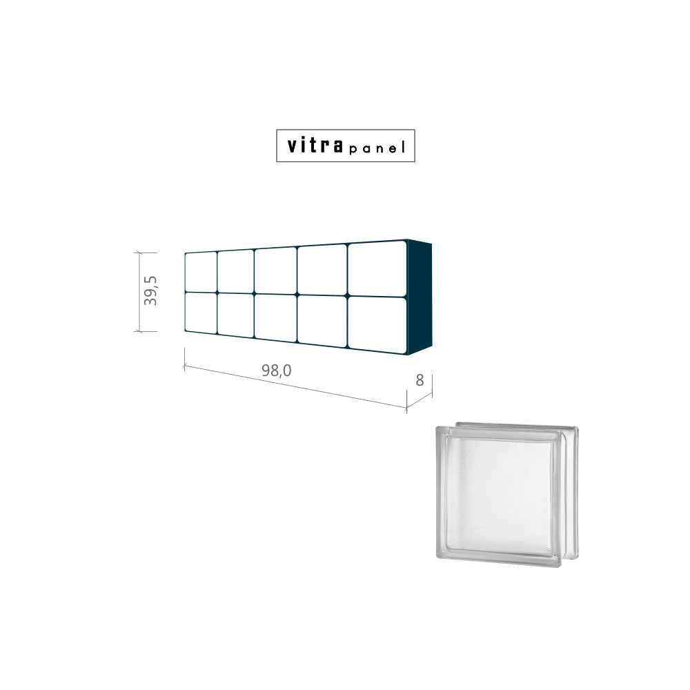 Smontovaný interiérový panel, připravený pro osazení do stavebního otvoru. Panel se montuje do stěn v interiéru. Není určen pro podlahy a venkovní stěny. Tento konkrétní panel je proveden z lesklých tvárnic, které propouštějí světlo, zároveň zachovávají soukromí díky dekoru "námrazy". VITRApanel lze vyrobit i v jiných velikostech za použití různých barev a typů skleněných tvárnic. Více informací se dozvíte ZDE.
