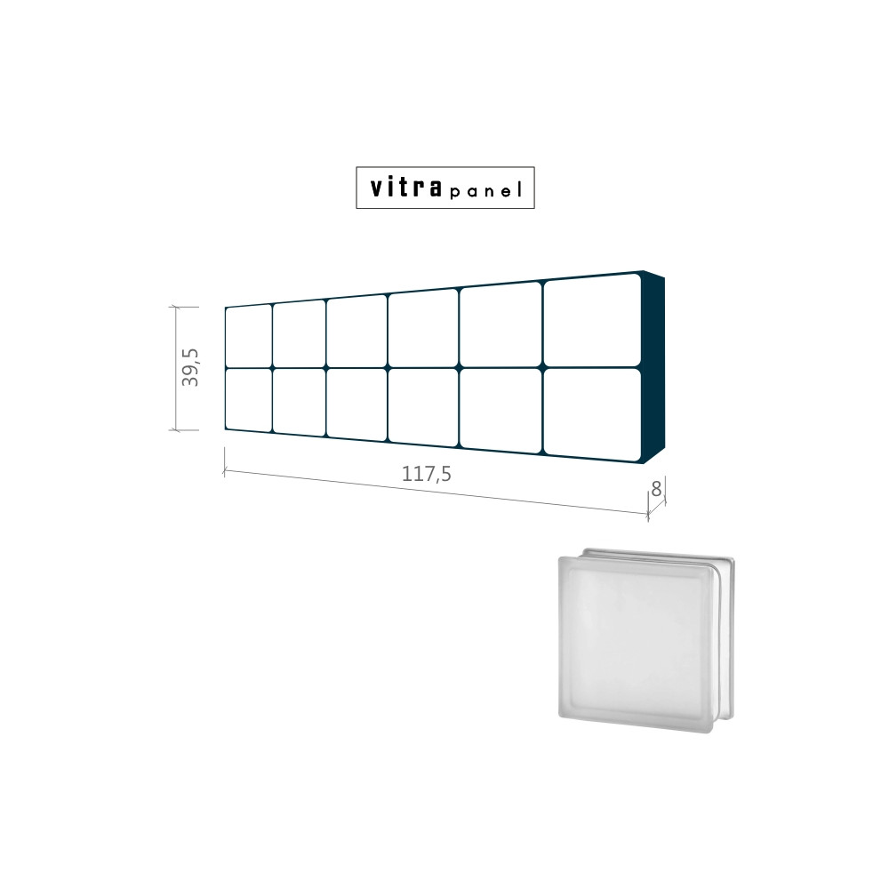 Smontovaný interiérový panel, připravený pro osazení do stavebního otvoru. Panel se montuje do stěn v interiéru. Není určen pro podlahy a venkovní stěny. Tento konkrétní panel je proveden z oboustranně pískovaných tvárnic, které propouští světlo a zároveň jsou zcela neprůhledné. VITRApanel lze vyrobit i v jiných velikostech za použití různých barev a typů skleněných tvárnic. Více informací se dozvíte ZDE.