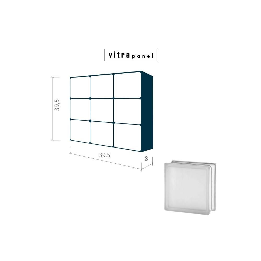 Smontovaný interiérový panel, připravený pro osazení do stavebního otvoru. Panel se montuje do stěn v interiéru. Není určen pro podlahy a venkovní stěny. Tento konkrétní panel je proveden z oboustranně pískovaných tvárnic, které propouští světlo a zároveň jsou zcela neprůhledné. VITRApanel lze vyrobit i v jiných velikostech za použití různých barev a typů skleněných tvárnic. Více informací se dozvíte ZDE.
